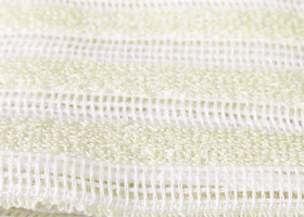 光沢のある、キメ細かいシルクパイル(家蚕絹紡糸)を縦縞に織りあげました。大切なお肌のための、エレガントなシルク・ボディタオルです。泡立ちをプラスした純白のシルク・タッチをお愉しみください。 |
