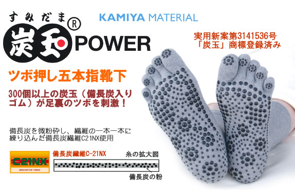 300個以上の硬質備長炭入りのゴム「炭玉」が足の裏のツボを刺激します。