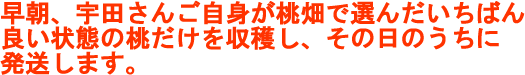 桃は気温の低い早朝に収穫するのが良いとされます。宇田農園では、朝一番に宇田さんが熟練の目で選別した良い状態の桃だけを収穫し、その日のうちに皆様へ発送いたします。そのため、天候や気温によって収穫の量が変わってきますので、おおよその発送時期は承りますが、配達日指定はお受けできません。 |