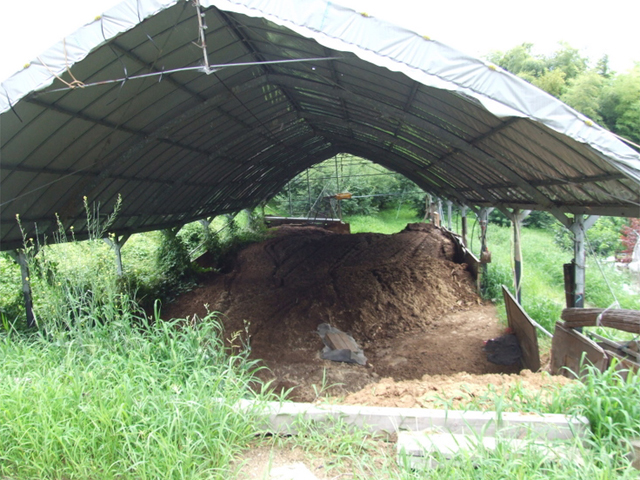 桃山の中腹にある堆肥場。2年の歳月をかけて完熟堆肥ができあがります。 |