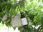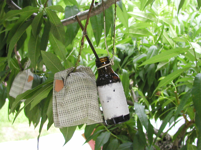 桃の木にぶら下げられたビンの中には害虫忌避のための竹酢液が入っています。 |
