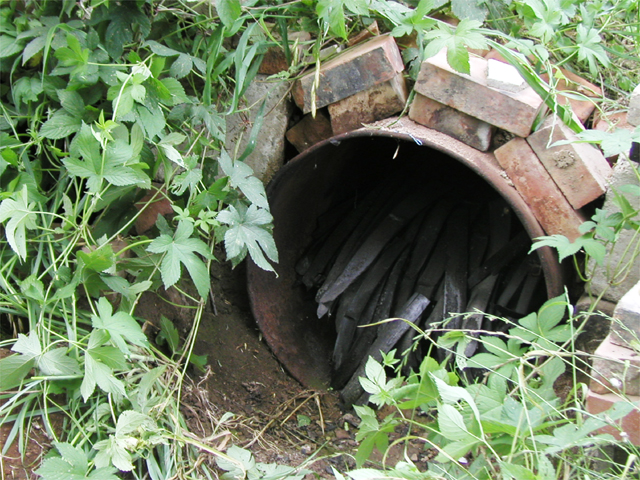 手作りの炭焼き窯。なんとご自分で竹炭と竹酢液まで作っておられます。 |