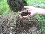 | やわらかく黒々した宇田農園の肥沃な土です。この土からおいしい桃が育ちます。 |