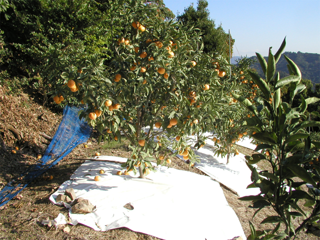 | この白いシートがマルチシートです。天候やみかんのそだち具合、樹の状態を見ながら使用されます。 |
