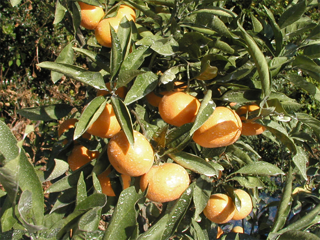 収穫前には白い粉はみかんだけでなく、樹の葉面にも散布され、おいしいみかんの仕上げに役立ちます。 |