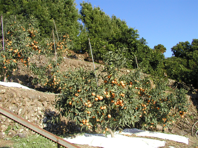 雲ひとつない透き通るような青い空の下、養分をしっかり溜め込んで美味しいみかんが育ちます。 |