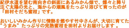 田村そだち蜜柑は、すべて手作業で丁寧にみかんを選別していますので、傷が少なく味がボケていません。 |