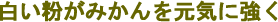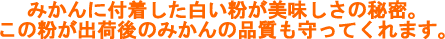 竹武農園のみかんについている白い粉は農薬ではございません。この白い粉の正体は、カルシウムや石灰、硫黄の混合物で人体には影響ありません。